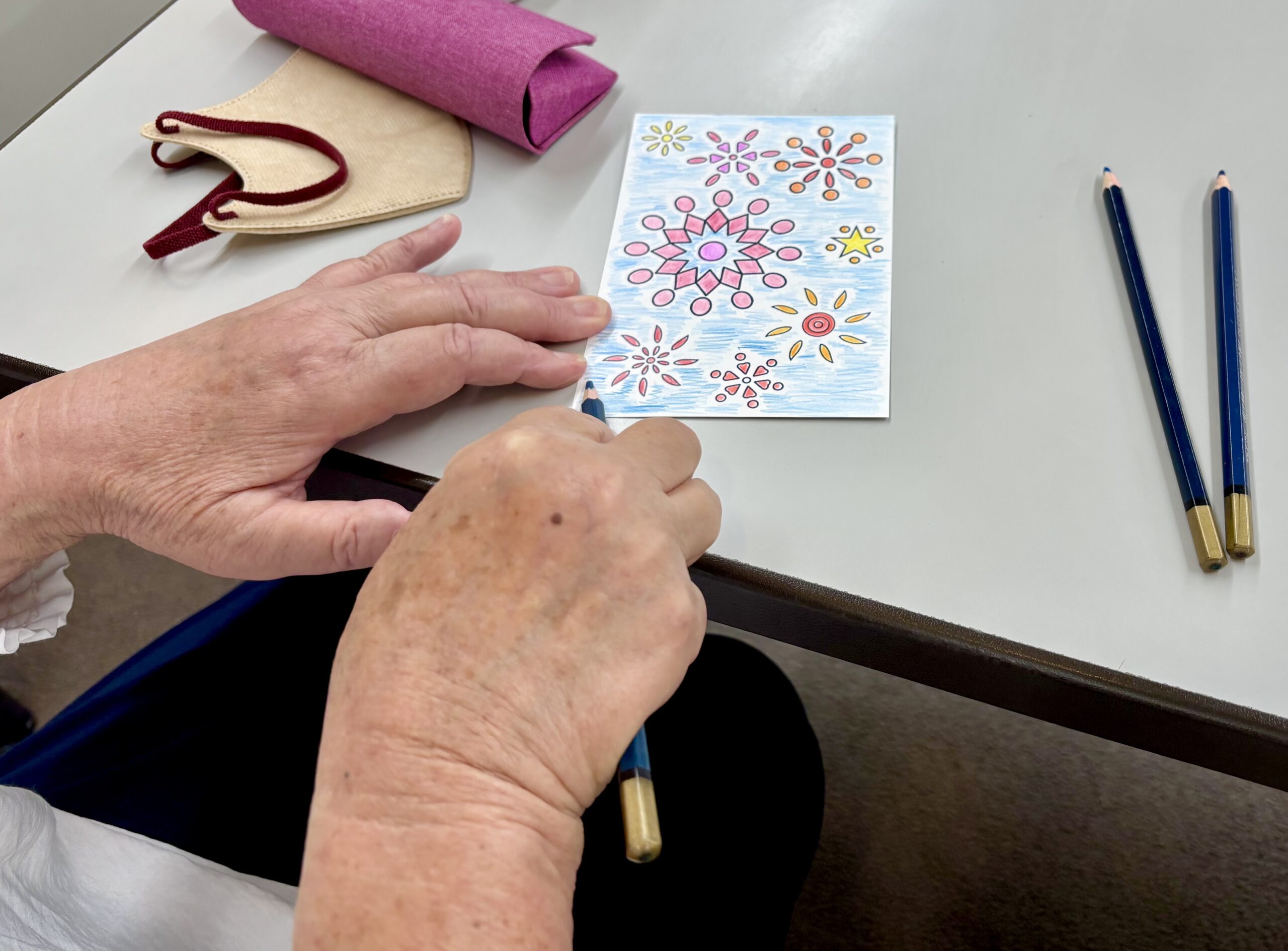 高齢者の女性が主体と聞き、絵手紙が楽しめるように水彩用の紙とオリジナルの花火塗り絵を準備。